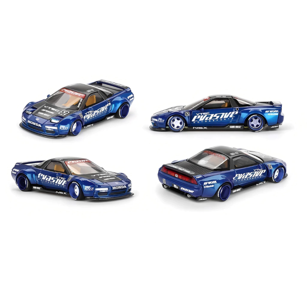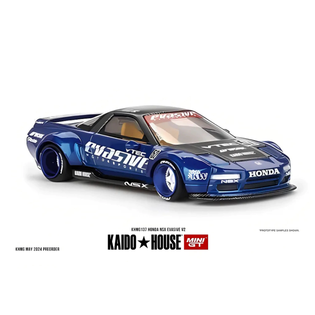 MINI GT KAIDO HOUSE HONDA NSX EVASIVE V2 AZUL é uma peça imperdível para colecionadores e amantes do automobilismo. Esta miniatura, na escala 1:64, captura a essência do icônico Honda NSX, apresentando detalhes impressionantes e um acabamento deslumbrante na cor azul.